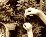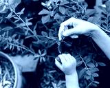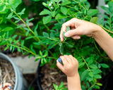 Little baby hands picking up fresh blueberry from backyard garden home fruit orchard in Dallas, Texas, top view toddler boy fingers harvesting homegrown ripe berries, organic edible landscape