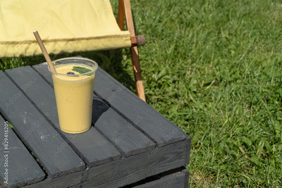 leżak wraz napojem na trawie w słoneczny dzień