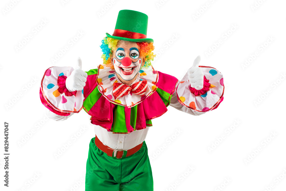 Funny clown thumbs up, man entertainer as Joker in a suit and wig, with clown whiteface makeup. Trickster, jester, pantomime, mime, and a professional actor at events