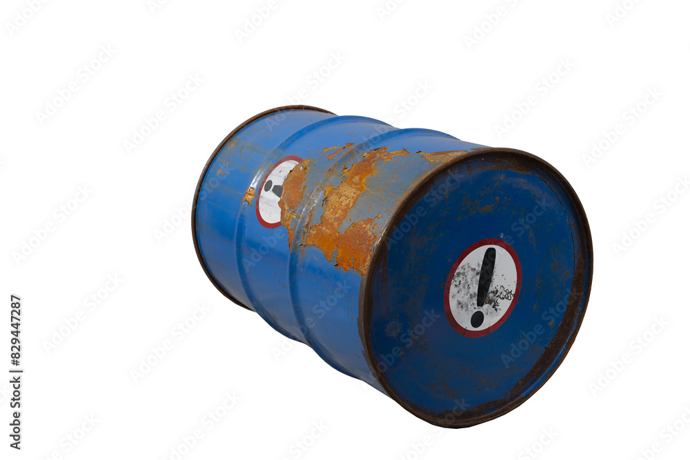 Blue barrel with biohazard warning exclamation mark, toxic waste. The symbol indicates that hazardous products death or poisoning. Rusty dangerous barrel with pathogens on isolated background