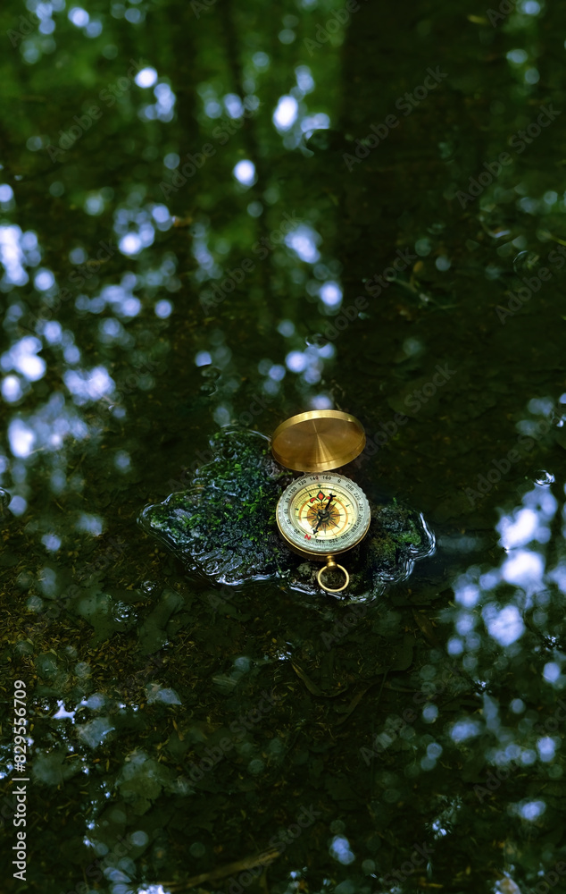 compas in forest, dark natural abstact background. Navigation Orientation concept in explore, hiking. finding direction, path. vacation trip season. symbol of travel, adventure, journey.