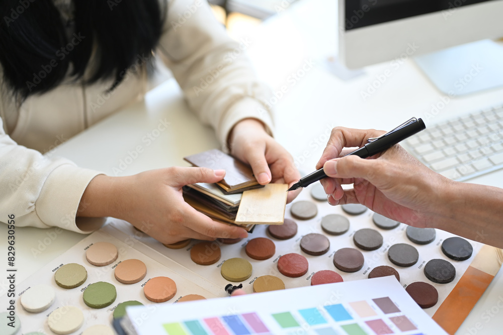 Interior designer giving advice to client, selecting design elements for new interior renovation project