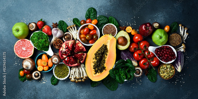 Healthy food clean eating selection: tropical fruit, vegetable, seeds, superfood. Healthy food.