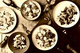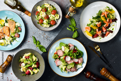 A set of dishes on a served table. Vegetable, meat and seafood dishes. Top view.