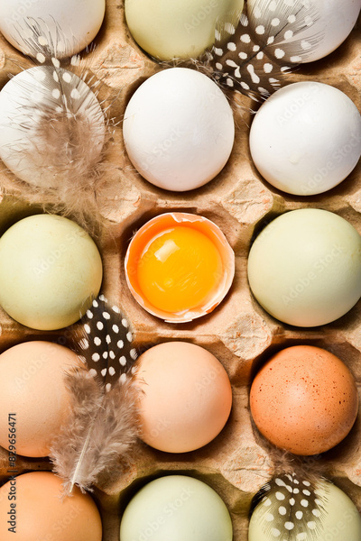 Background of chicken eggs. Raw organic chicken eggs. Top view.