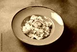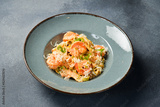 Italian pasta with shrimp and parmesan cheese. In a plate. Restaurant dish. Close up.