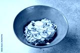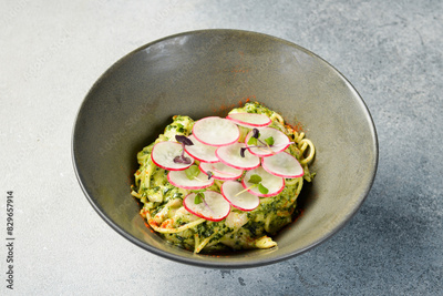 Italian pasta with cheese, pesto sauce and radish. In a plate. Top view.