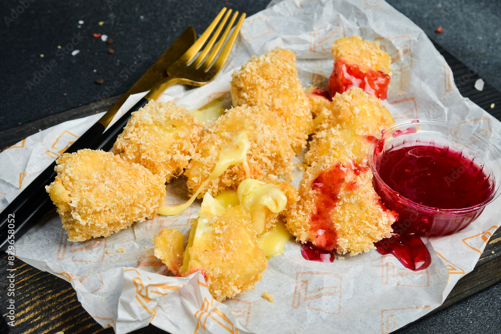 Brie cheese is deep-fried with cranberry sauce. Close up.