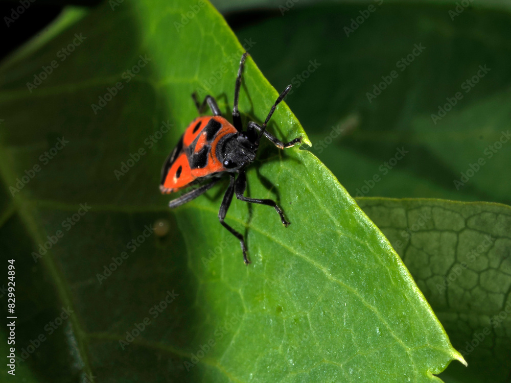 Harlequin Black-red beetle on a leaf, Lygaeus equestris close up macro