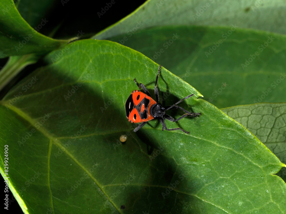 Harlequin Black-red beetle on a leaf, Lygaeus equestris close up macro