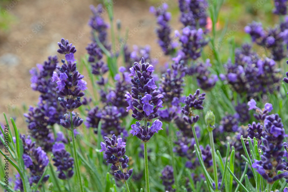 Close up of violet flowers Lavandula angustifolia (true lavender or English lavender, garden, narrow-leaved lavender). Lavender inflorescence on green blurred background.