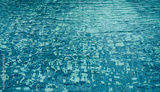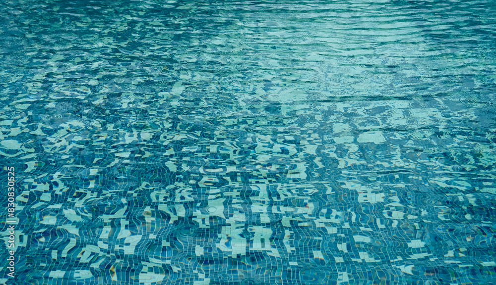 Water surface texture sunlight reflection blue wave background,Swimming pool bottom caustics ripple and flow with waves background. Summer background banner,Overhead view of pond