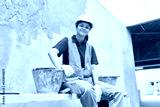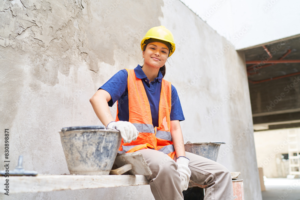 Portrait of confident young female bricklayer amidst buckets sitting against wall at construction site