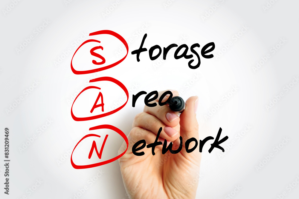 SAN Storage Area Network - computer network which provides access to consolidated, block-level data storage, acronym text concept