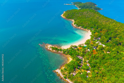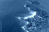 Beach with beautiful coastline. Tropical bay surrounded by coral reefs, aerial top view