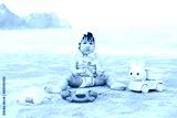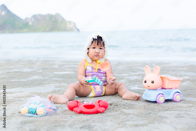 Girl playing in the sand on the beach on vacation,cute little girl playing with sand on tropical beach