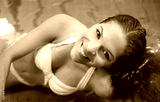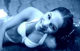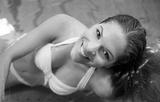 Smile, swimming pool and woman at hotel with portrait, holiday and calm summer weekend in swimwear. Peace, water and happy girl at luxury spa for cool vacation with hospitality, health and wellness.