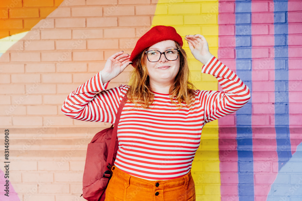 Young smiling fashion plus size woman in bright clothes posing on painted brick background. Body positive. Female freedom. Urban street fashion style. Confident happy satisfied overweight model.