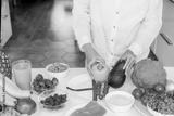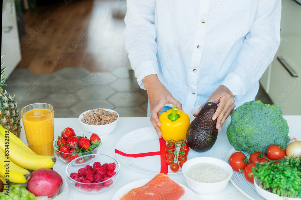 Female Nutritionist expert makes healthy balanced diet plate according to proportions of nutrients. Plate with pie chart of fruit, vegetables, grains, proteins on kitchen table with ingredients.