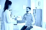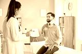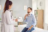 Man with neck injury having appointment with doctor. Female doctor with clipboard talking to male patient with support brace on injured neck. Young man wearing neck collar sitting on bed at clinic