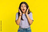 Oh my God, Wow. Excited amazed winner woman raising hands in surprise looking at camera with big eyes, shocked by sudden victory celebrating success achievement good news. Girl on yellow background