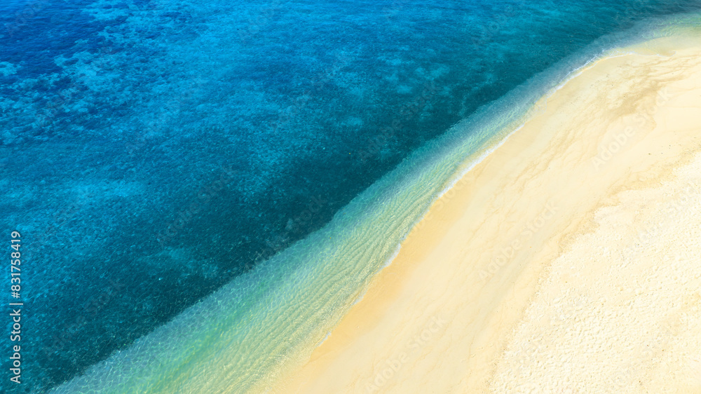 Nature of the beach and sea Summer with sunshine, sandy beaches, clear blue waters sparkling against the blue sky. On an island with good ecology and environment Background for summer vacation concept