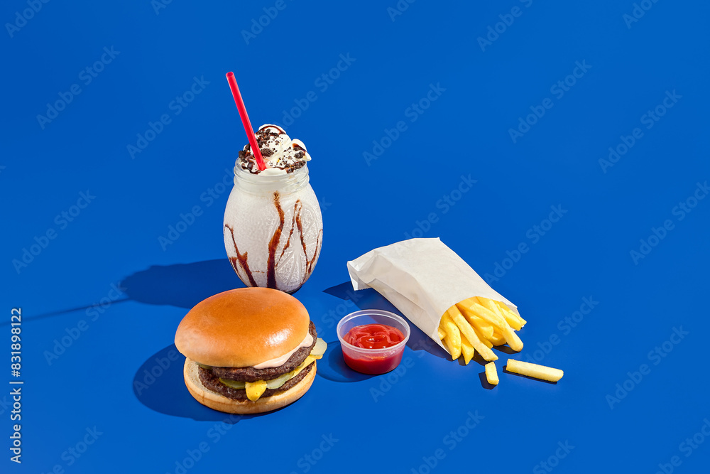 Tempting combo meal with burger, fries, sauce, and milkshake on a blue background. Minimalist style showcases fast food in a modern, unhealthy way