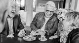Happy senior people having breakfast sitting at coffee bar - Group of older friends having fun in rooftop restaurant - Life style concept with smiling men and women at cafe terrace