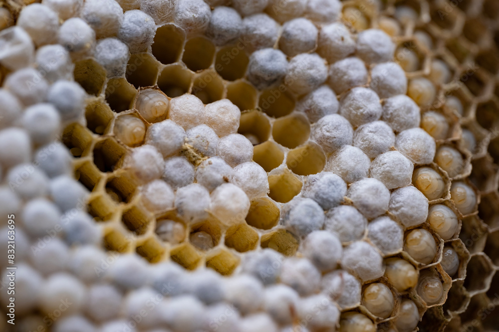 wasp honeycombs Close-up, Natural bees nest, insect habitat with larvae, wasp eggs, colony Vespula vulgaris dangerous insects, potential hazard