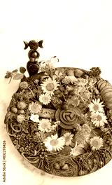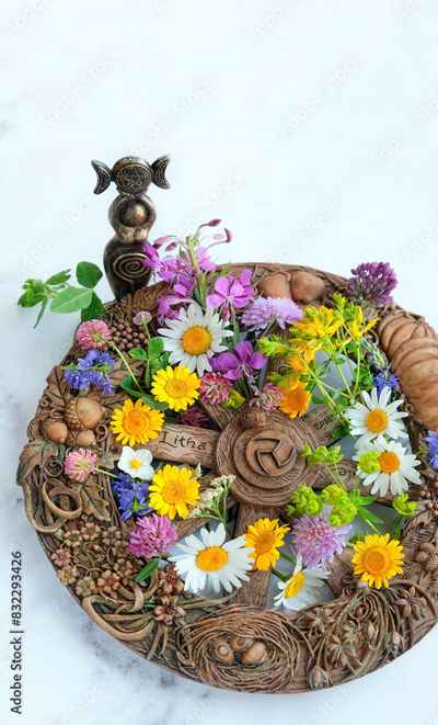 Altar for Summer solstice, Litha wiccan holiday. wheel of the year with colorful flowers and Goddess figurine on table, abstract background. symbol of summer celtic wiccan sabbat