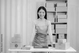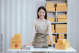 Startup SME small business entrepreneur, young Asian woman, freelancer working at home office, box, smartphone, laptop, online, marketing, packaging, shipping, b2b, SME, ecommerce concept ..