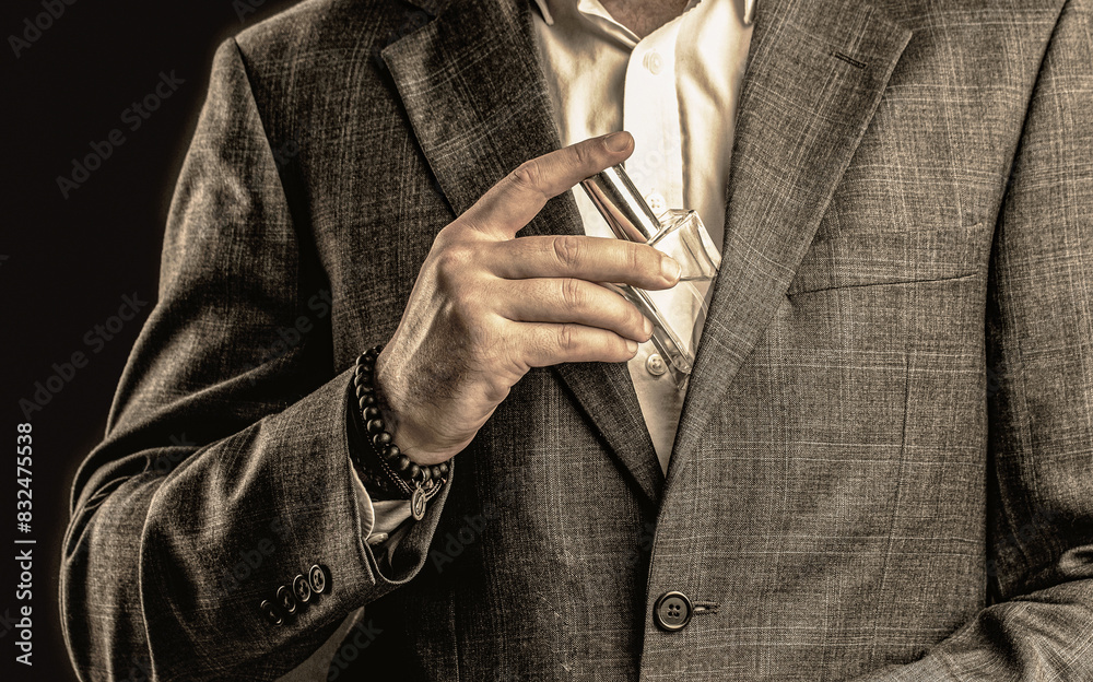 Male fragrance and perfumery, cosmetics. Man perfume, fragrance. Perfume or cologne bottle. Man holding up bottle of perfume. Man holds cosmetics, serum in a vial, applying on the hands