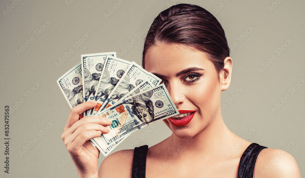 Portrait of a playful young woman with holding bunch of money banknotes. Woman holding lots of money in dollar currency. Luxury, beauty and money concept. Woman with dollars in hand