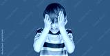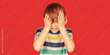 Little boy having headache. Portrait of a little boy holding her head with hands, red background