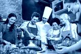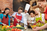 happy friends and chef cook cooking in kitchen