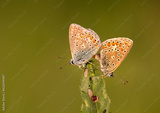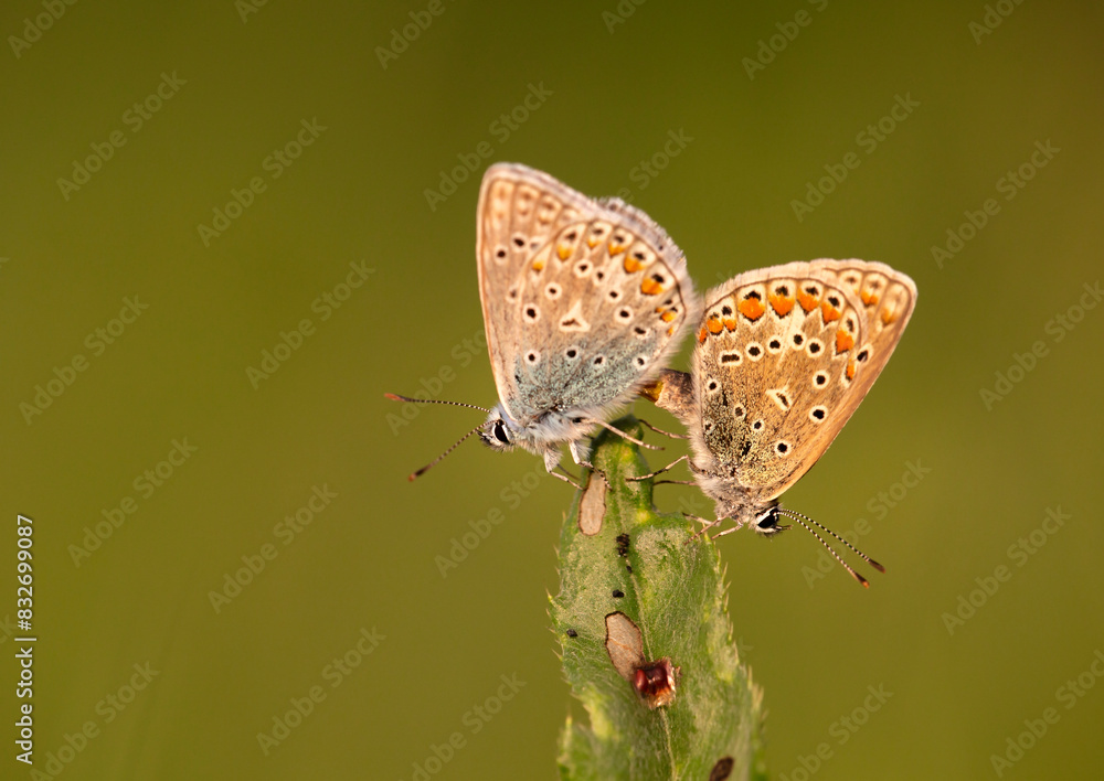 Parka Modraszków Ikar w trakcie kopulacji na zielonym tle.