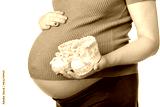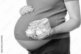 Side view of pregnant woman holding woolen baby shoes isolated on white
