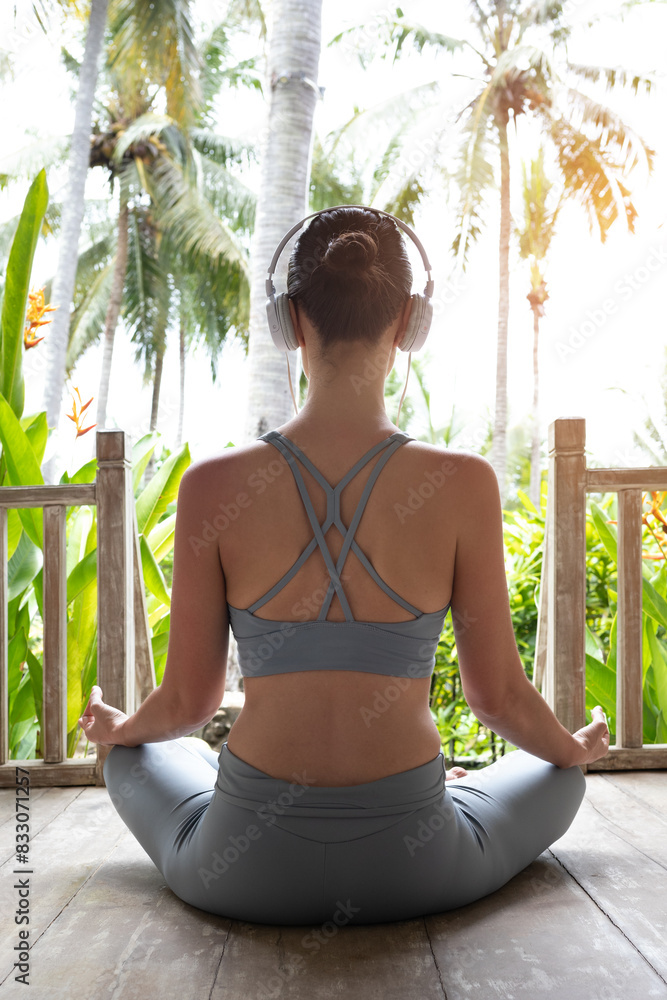 Rear view image of young woman meditating in nature using headphones. Vertical image.