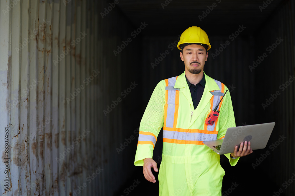 worker or engineer holding laptop computer and look around inside containers warehouse storage