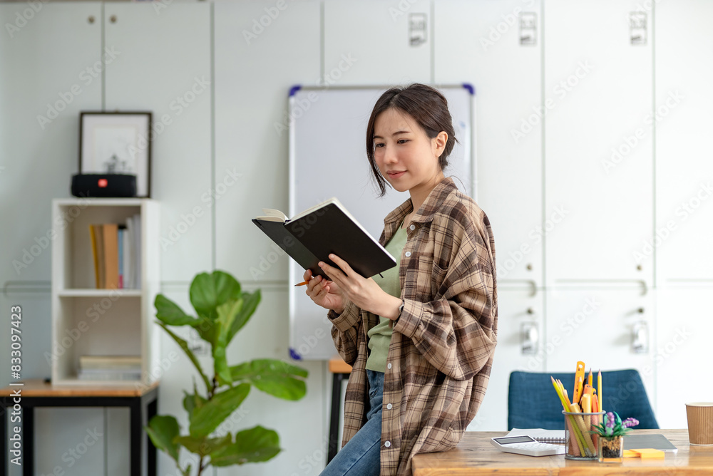 Young woman holding and reading a book while standing in an office, with shelves and a plant in the background.