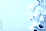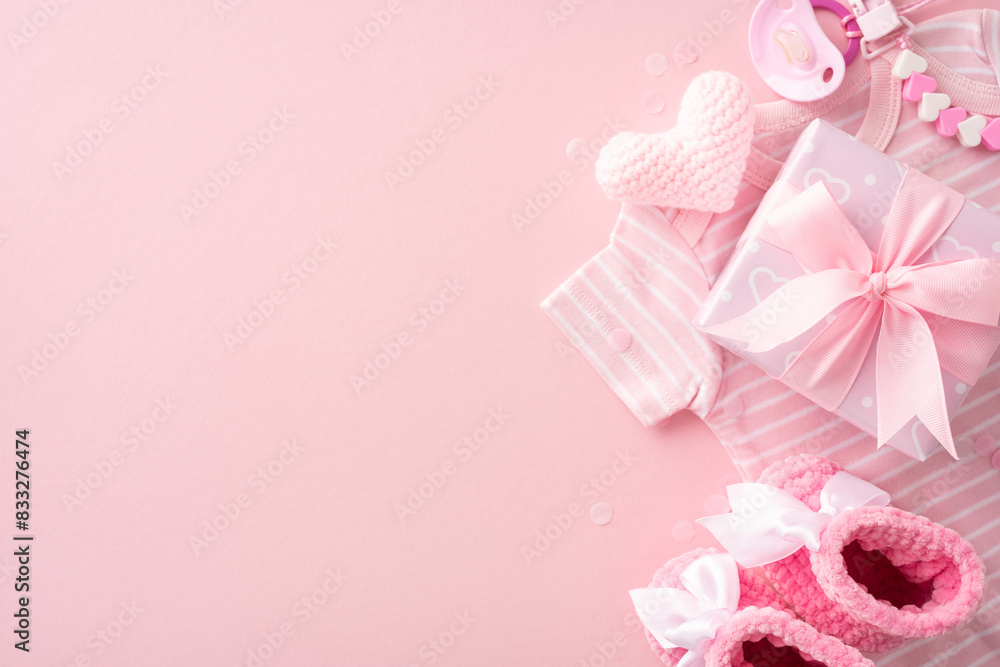 Assorted pink baby shower gifts and accessories, including a heart, pacifier, and baby clothes on a pastel background