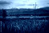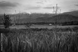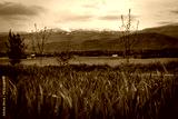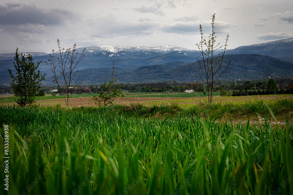Widok z zielonego pola na ośnieżone szczyty Karkonoszy.