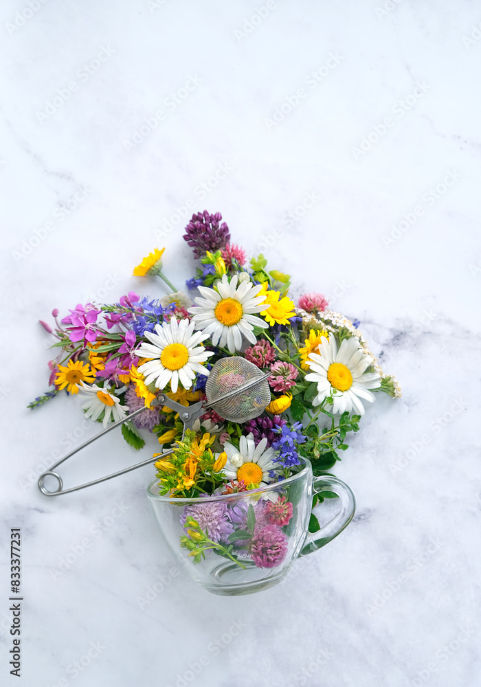 colorful flowers, herbs in glass cup and metal strainer on table. Flavor useful herbal tea, organic healthy beverage. ingredients of natural wild plants for Fragrance natural floral tea. top view