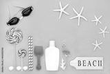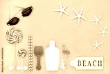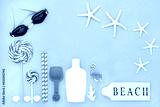 Summer holiday suntan lotion, swimming goggles, beach sign, accessories, symbols and decorations. Fun travel tourism vacation concept on pastel blue background.