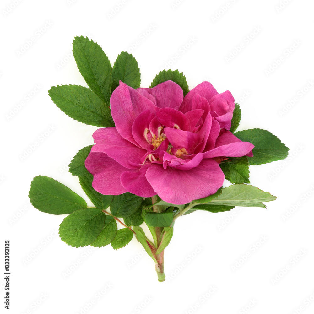Rosa rugosa red rose flower on white background. Wildflower used in floral food decoration and herbal medicine. Treats stomach aches, diarrhea, inflammatory disease, gastritis. Rosaceae.