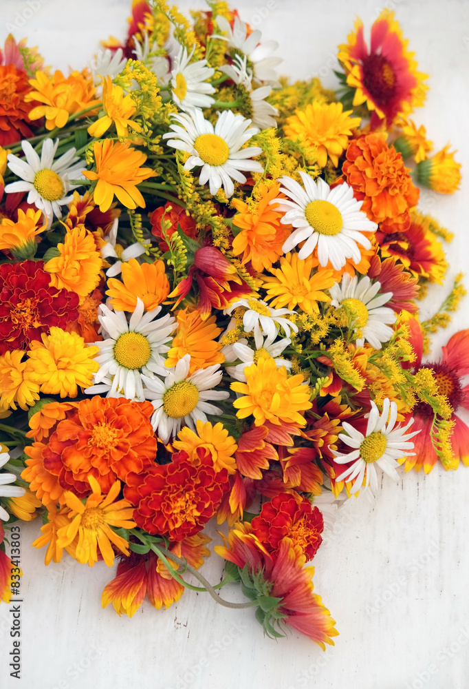 Summer background. bright colorful flowers of calendula, marigold (tagetes), chamomile on white table close up. floral beautiful image. soft focus