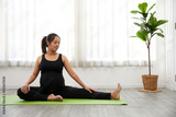 pregnant woman in sportswear doing fitness stretching exercise and yoga workout