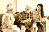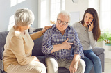 Family calls an ambulance for father experiencing a heart attack or heart disease at home. This emergency situation requires immediate aid, and they quickly use the phone to seek help.