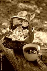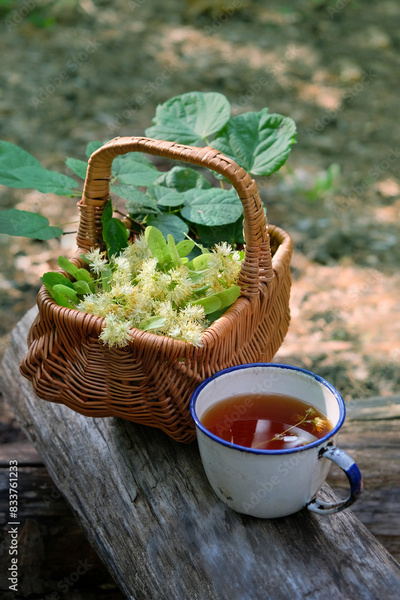 enamel mug with tea, basket with linden flowers and leaves in forest, natural background. fresh harvest of linden for healing useful herbal tea. alternative traditional medicine remedy