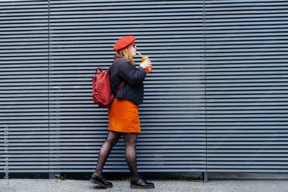 Smiling plus size woman in heart shaped sunglasses and bright clothes drinking sugar flavored tapioca bubble tea near striped urban wall. Happy fashionable hipster overweight girl. Street fashion.